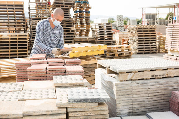 کارگر ساختمانی با ماسک و پالت سنگفرش – فروش‌یاب، خرید و فروش عمده، آگهی تجاری